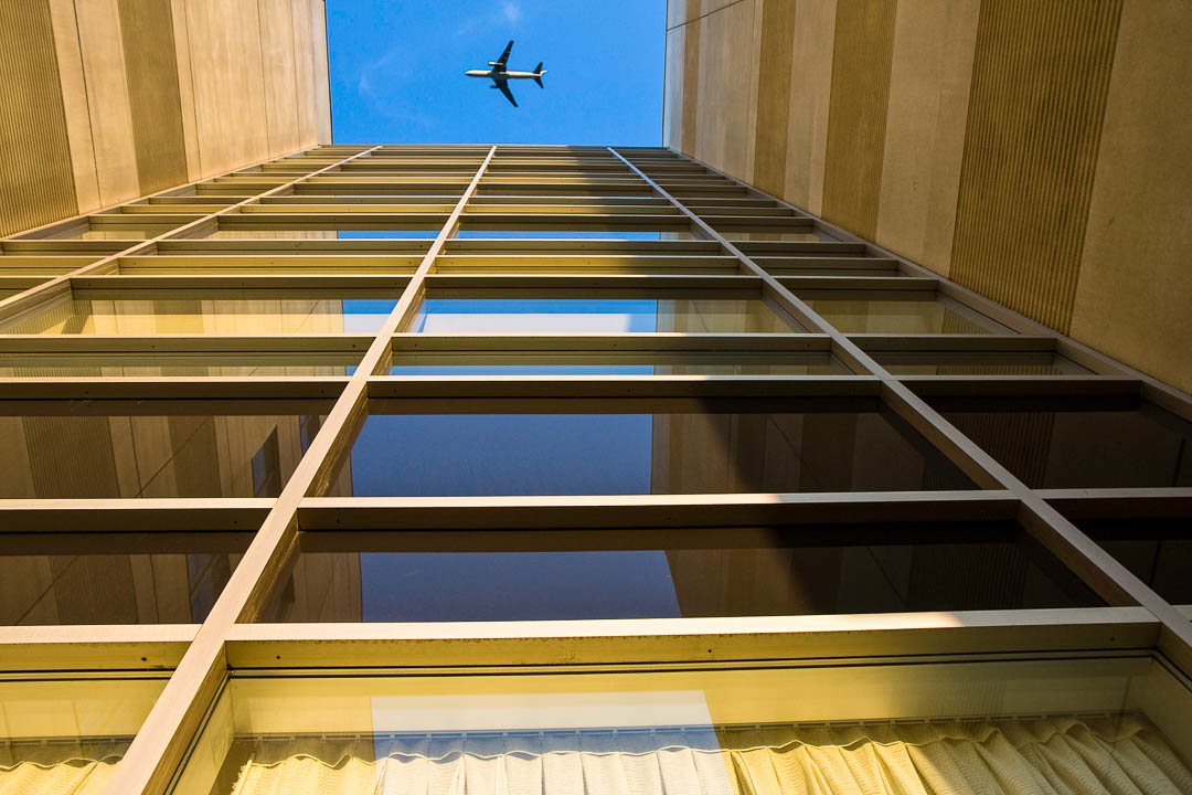 While staying in Montreal, I took a walk around the hotel after dinner. I found this alcove right under the takeoff path from Runway 06 Right at Dorval/Pierre Elliot Trudeau airport (referred to as “YUL” in aviation short-hand) and realized that, if I waited, I would be able to catch an aircraft right in the gap. I had to wait quite a while as most of the aircraft taking off were smaller aircraft that were too high by the time they got to the “sweet spot”. Finally, a heavier and larger aircraft came by and I was able to get the shot.
